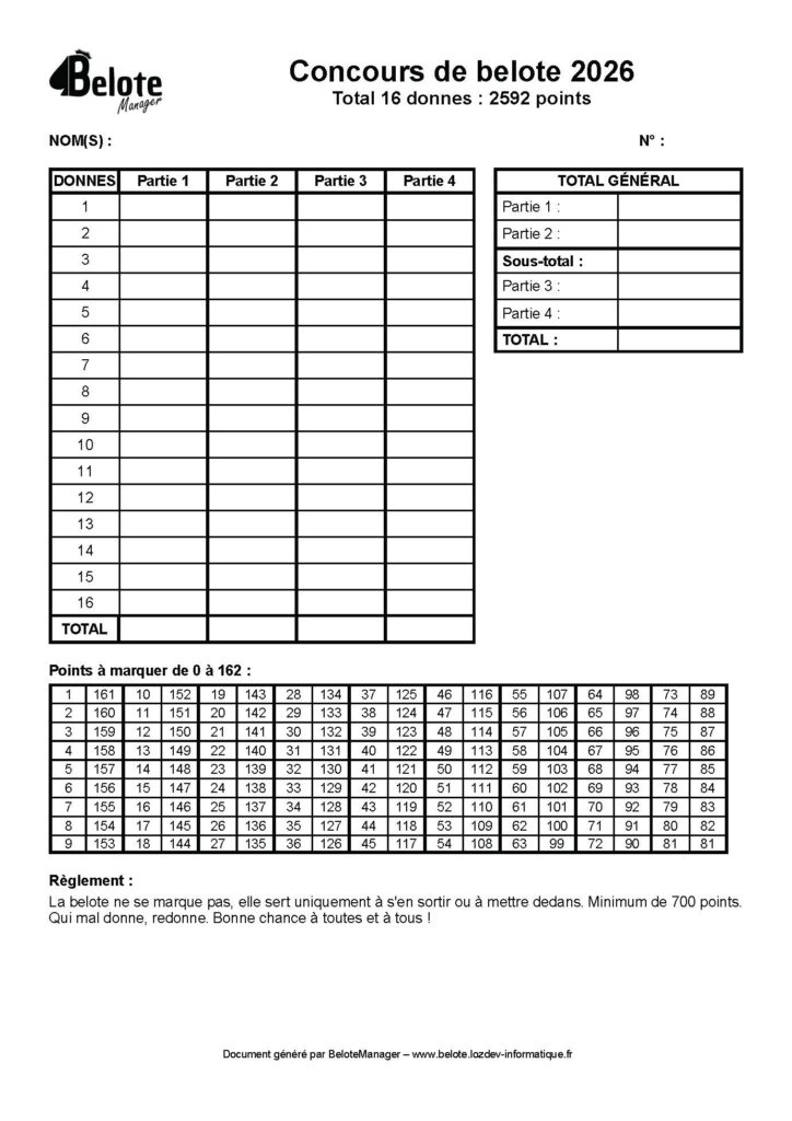 ✨ Nouvelle fonctionnalité : Impression de la feuille de saisie des scores selon les paramètres définis (nombre de parties, nombre de donnes par partie).